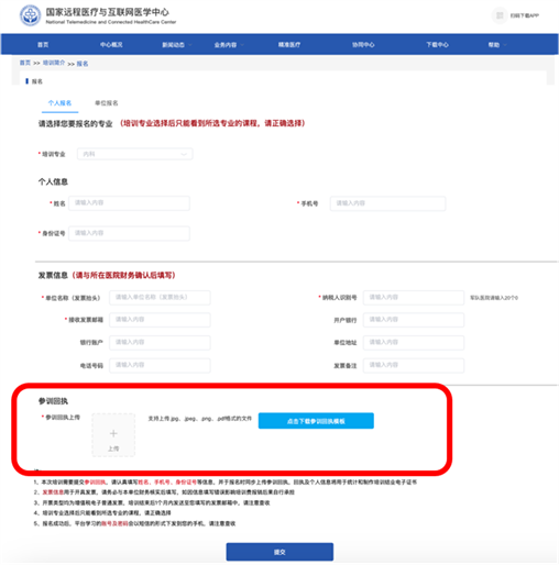 (一)回执模板可使用手机微信扫描报名二维码下载或电脑端登录国家远程医疗与互联网医学中心平台(http://www.ntmchc.com/),点击首页“全国住院医师规范化培训临床实践能力考核考官线上培训班”图片进入专题页面,在页面下方【报名入口】内选择【个人报名】或【单位报名】标签页,在页面下方【参训回执】处下载。