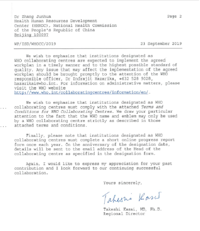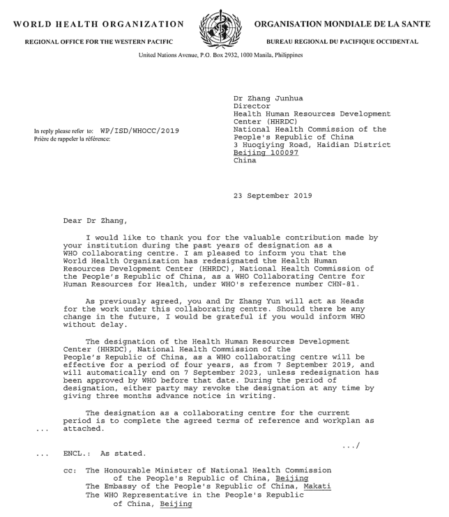 In September 2019, Health Human Resources Development Center of National Health Commission of China (HHRDC) was successfully redesignated as the WHO Collaborating Center for Human Resources for Health for a period of four years.